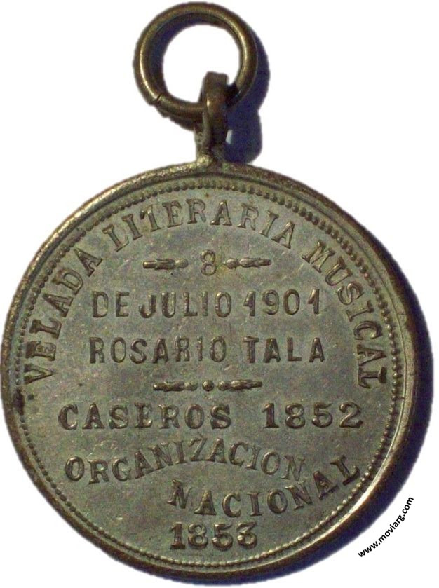 Anverso: HOMENAJE AL CAPITAL GENERAL JUSTO J. DE URQUIZA. Firma: B. Y R. Reverso: VELADA LITERARIA MUSICAL / 8 / DE JULIO 1901 / ROSARIO TALA / CASEROS 1852 / ORGANIZACION / NACIONAL / 1853 Referencia: | |