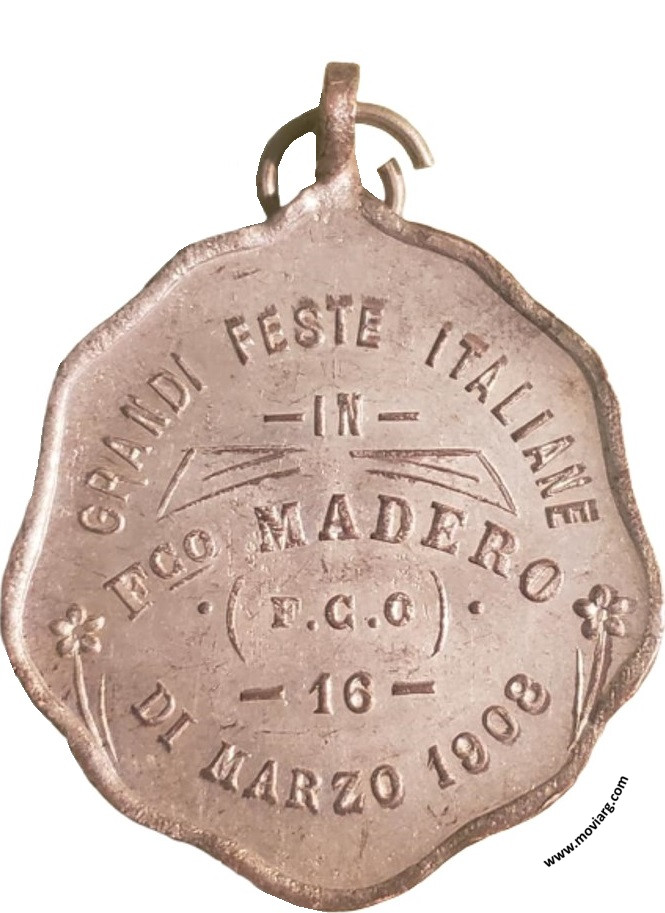 Anverso: Reverso: GRANDI FESTE ITALIANE / IN / FCO. MADERO / ( F. C. O ) / 16 / DI MARZO 1908 Referencia: | |