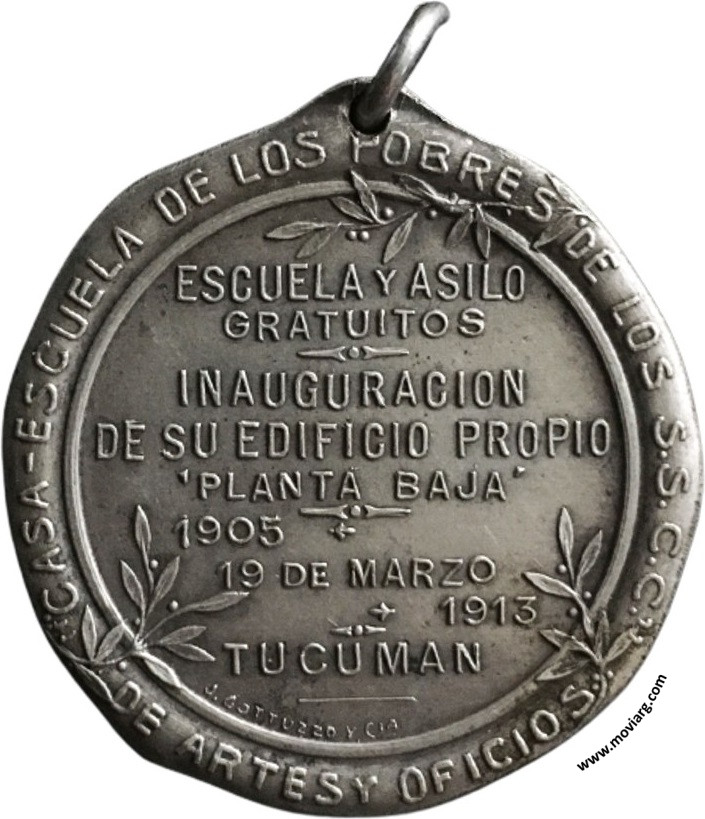 Anverso: Reverso: CASA - ESCUELA DE LOS POBRES DE LOS S.S.C.C. / DE ARTES Y OFICIOS / ESCUELA Y ASILO / GRATUITOS / INAUGURACION / DE SU EDIFICIO PROPIO / ' PLANTA BAJA ' / 1905 / 19 DE MARZO / 1913 / TUCUMAN. Firma: J. GOTTUZZO Y CIA. Referencia: | |