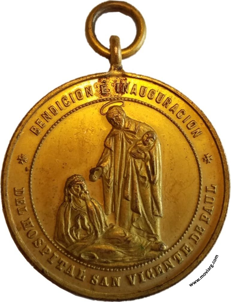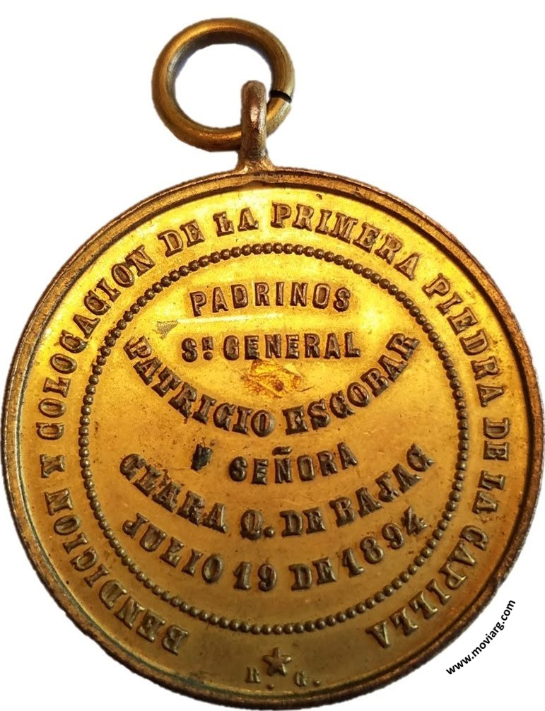 Anverso: BENDICION É INAUGURACION / DEL HOSPITAL SAN VICENTE DE PAUL Reverso: BENDICION Y COLOCACION DE LA PRIMERA PIEDRA DE LA CAPILLA / PADRINOS / SR. GENERAL / PATRICIO ESCOBAR / Y SEÑORA / CLARA Q. DE BAJAC / JULIO 19 DE 1894. Firma: R. G. Canto: Humberto Burzio: "Buenos Aires en la medalla" 1981 p1012. Referencia: BURZIO-3191 | |