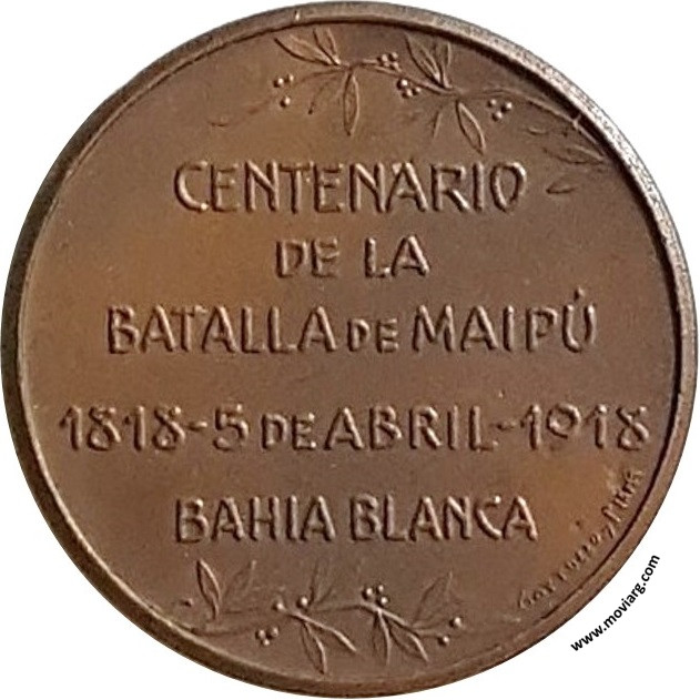 Anverso: SAN MARTIN / O'HIGGINS Reverso: CENTENARIO / DE LA / BATALLA DE MAIPÚ / 1818 - 5 DE ABRIL - 1918 / BAHIA BLANCA. Firma: GOTTUZZO Y PIANA Referencia: | |