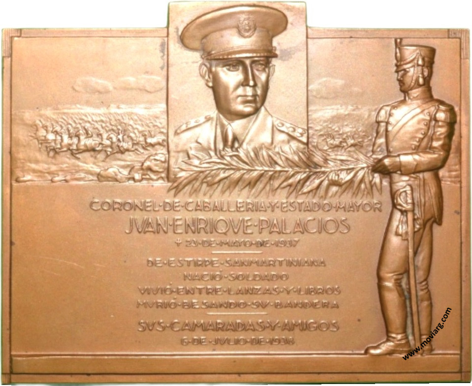 Anverso: CORONEL DE CABALLERIA Y ESTADO MAYOR / JUAN ENRIQUE PALACIOS / 23 DE MAYO DE 1937 / DE ESTIRPE SANMARTINIANA / NACIÓ SOLDADO / VIVIÓ ENTRE LANZAS Y LIBROS / MURIÓ BESANDO SU BANDERA / SUS CAMARADAS Y AMIGOS / 6 DE JULIO DE 1938 Reverso: Referencia: | |