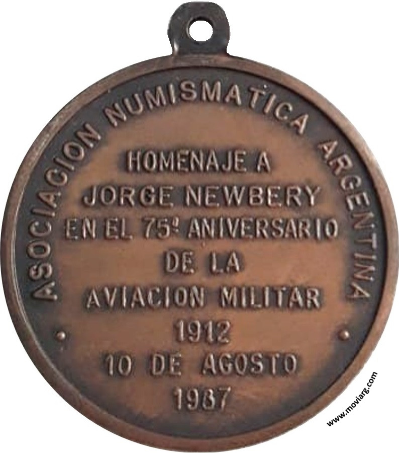 Anverso: JORGE NEWBERY. Firma: L. RODRIGUEZ Reverso: ASOCIACION NUMISMATICA ARGETINA / HOMENAJE A / JORGE NEWBERY / EN EL 75° ANIVERSARIO / DE LA / AVIACION MILITAR / 1912 / 10 DE AGOSTO / 1987 Referencia: | |