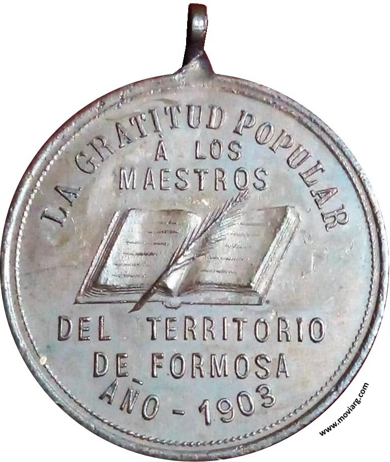 Anverso: LA GRATITUD POPULAR / A LOS / MAESTROS / DEL TERRITORIO / DE FORMOSA / AÑO - 1903 Reverso: LA ESCUELA / ES EL / TEMPLO SOBERANO / EN EL QUE / OFICIA / EL PENSAMIENTO / HUMANO. Firma: BELLAGAMBA Y ROSSI Referencia: | |