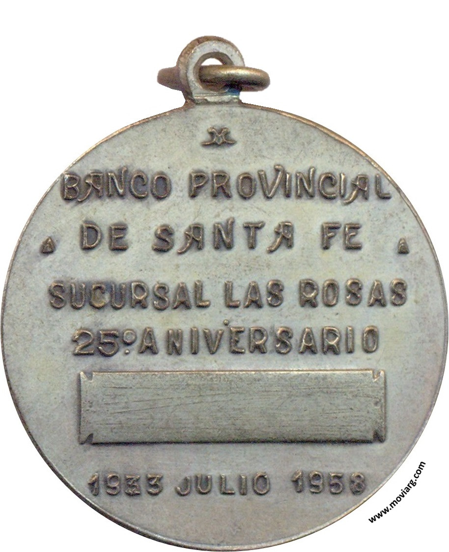 Anverso: Reverso: BANCO PROVINCIAL / DE SANTA FE / SUCURSAL LAS ROSAS / 25° ANIVERSARIO / 1933 JULIO 1958 Referencia: | |