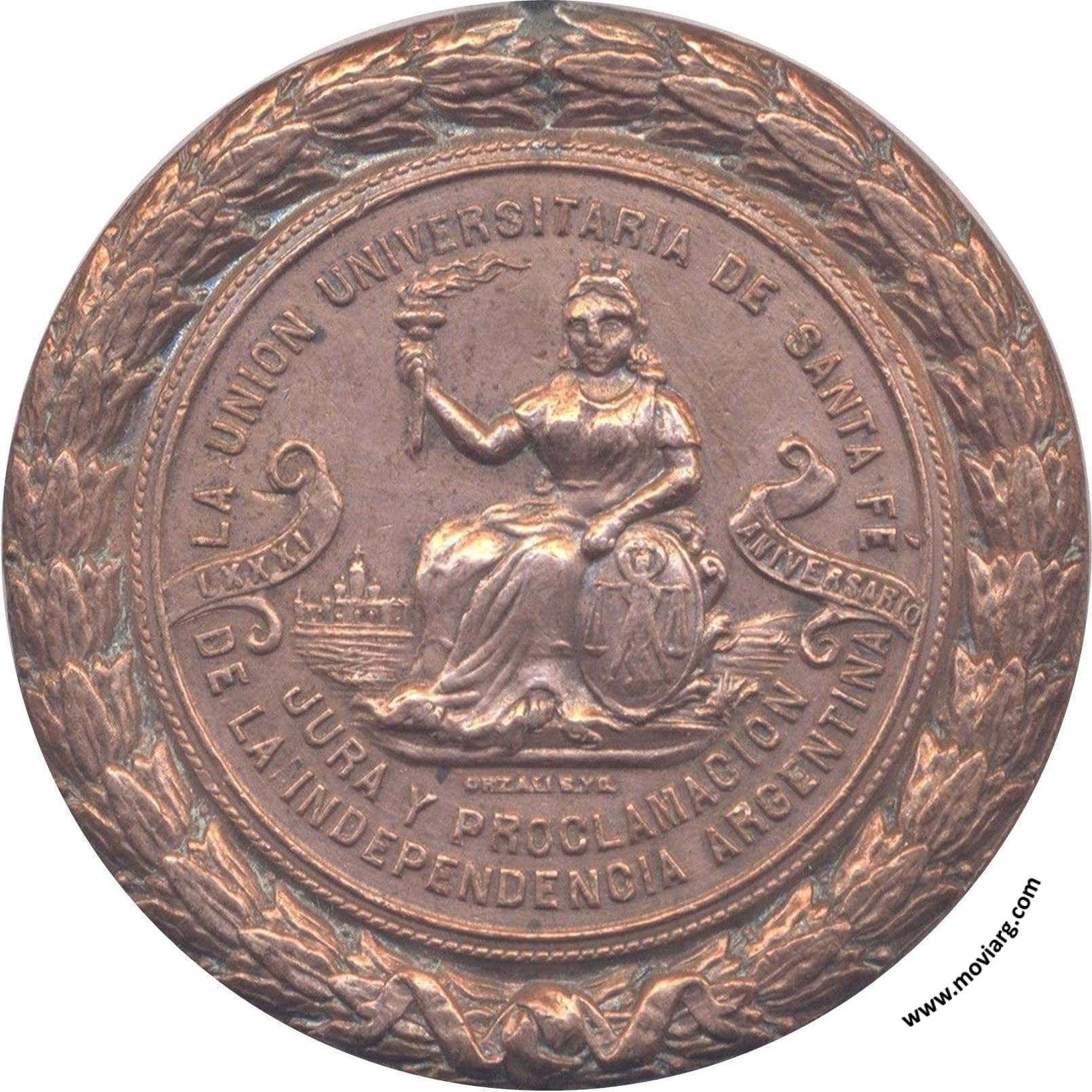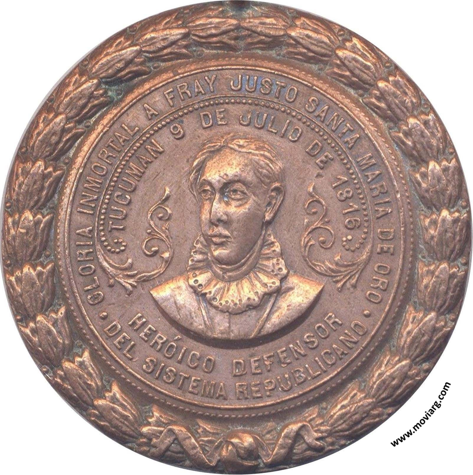 Anverso: GLORIA INMORTAL A FRAY JUSTO SANTA MARIA DE ORO / HERÓICO DEFENSOR / DEL SISTEMA REPUBLICANO / TUCUMAN 9 DE JULIO DE 1816 Reverso: LA UNION UNIVERSITARIA DE SANTA FÉ / JURA Y PROCLAMACION / DE LA INDEPENDENCIA ARGENTINA / LXXXI / ANIVERSARIO. Firma: ORZALI B. Y C. Referencia: | |