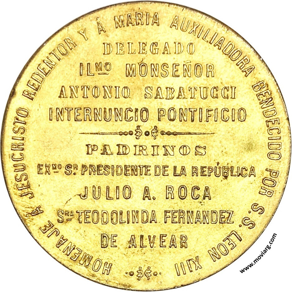 Anverso: COLOCACION DE LA PIEDRA FUNDAMENTAL DEL NUEVO TEMPLO DE SAN CARLOS / BUENOS AIRES / ( ALMAGRO ) 24 DE JUNIO 1900 / PROMOTORES : LOS FELIGRESES DE S. CARLOS Y LOS COOPERADORES SALESIANOS. Firma: BELLAGAMBA Y ROSSI Reverso: HOMENAJE Á JESUCRISTO REDENTOR Y Á MARIA AUXILIADORA BENDECIDO POR S.S. LEON XIII / DELEGADO / ILMO. MONSEÑOR / ANTONIO SABATUCCI / INTERNUNCIO PONTIFICIO / PADRINOS: / EXMO. SR. PRESIDENTE DE LA REPÚBLICA / JULIO A. ROCA / SRA. TEODOLINA FERNANDEZ / DE ALVEAR Referencia: | |