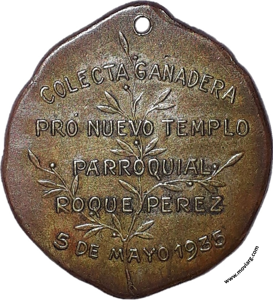Anverso: CHARITAS Reverso: COLECTA GANADERA / PRO NUEVO TEMPLO / PARROQUIAL / ROQUE PEREZ / 5 DE MAYO 1935 Referencia: | |