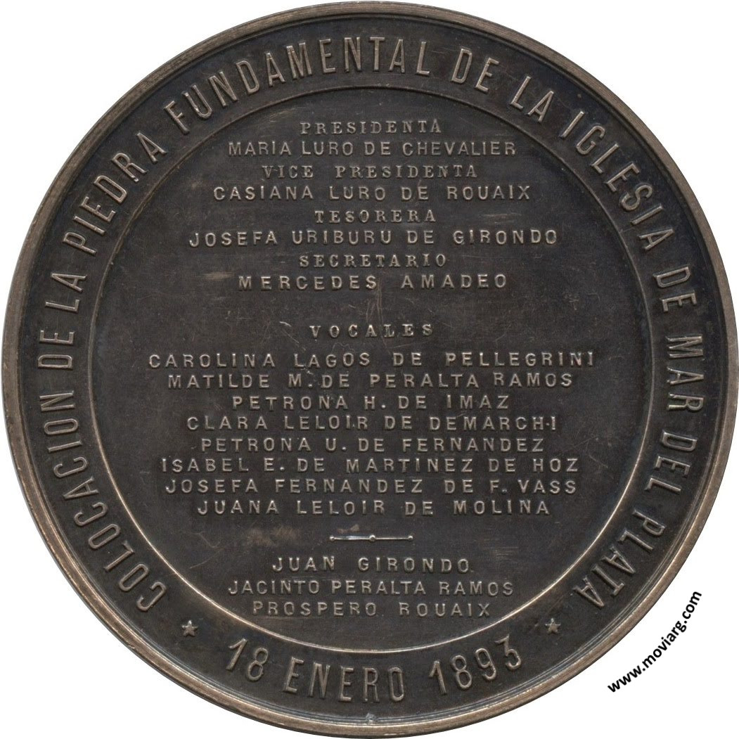 Anverso: JULIO A. COSTA / PADRINO / AGUSTINA P. DE COSTA / MADRINA. Campo: SAN PEDRO / INGENIERO / PEDRO BENOIT. Firma: TALLER NACIONAL / BUENOS AIRES Reverso: COLOCACION DE LA PIEDRA FUNDAMENTAL DE LA IGLESIA DE MAR DEL PLATA / 18 ENERO 1893 / PRESIDENTA / MARIA LURO DE CHEVALIER / VICE PRESIDENTA / CASIANA LURO DE ROUAIX / TESORERA / JOSEFA URIBURU DE GIRONDO / SECRETARIO / MERCEDES AMADEO / VOCALES / CAROLINA LAGOS DE PELLEGRINI / MATILDE M. DE PERALTA RAMOS / PETRONA H. DE IMAZ / CLARA LELOIR DE DEMARCHI / PETRONA U. DE FERNANDEZ / ISABEL E. DE MARTINEZ DE HOZ / JOSEFA FERNANDEZ DE F. VASS / JUANA LELOIR DE MOLINA / JUAN GIRONDO / JACINTO PERALTA RAMOS / PROPERO ROUAIX Referencia: | |