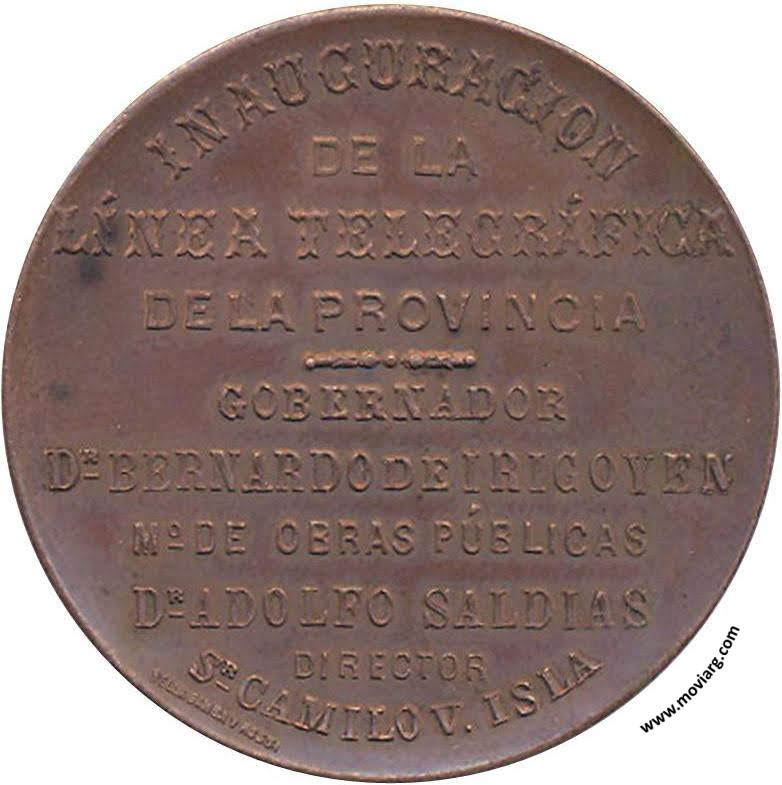 Anverso: JUNIO DE 1901 / COLONIA / URIBELARREA. Firma: BELLAGAMBA Y ROSSI Reverso: INAUGURACION / DE LA / LÍNEA TELEGRÁFICA / DE LA PROVINCIA / GOBERNADOR / DR. BERNARDO DE IRIGOYEN / MO. DE OBRAS PÚBLICAS / DR. ADOLFO SALDIAS / DIRECTOR / SR. CAMILO V. ISLA. Firma: BELLAGAMBA Y ROSSI Referencia: | |