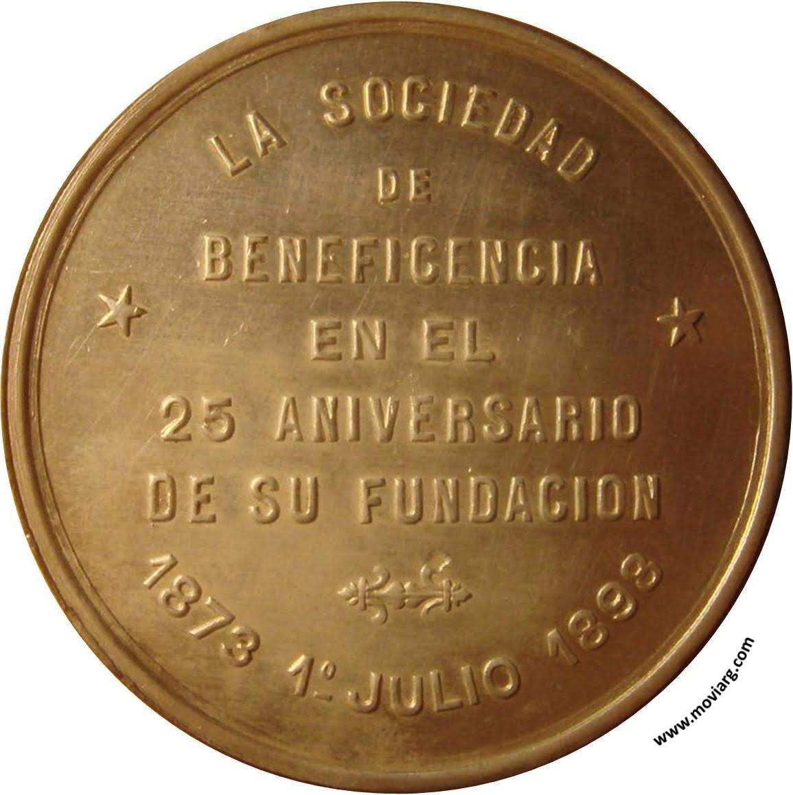 Anverso: SOCIEDAD DE BENEFICENCIA DEL RIO CUARTO. Firma: ORZALI B. Y C. Reverso: LA SOCIEDAD / DE / BENEFICENCIA / EN EL / 25 ANIVERSARIO / DE SU FUNDACION / 1873 1° JULIO 1898 Referencia: | |