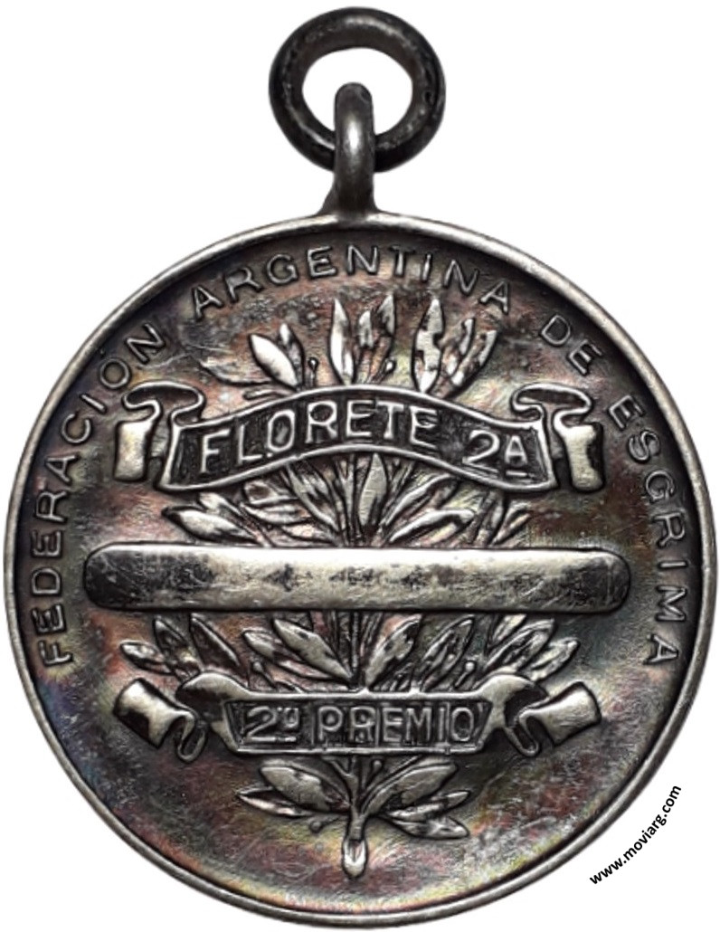 Colección MDS Anverso: PREMIO MUNICIPALIDAD DE BUENOS AIRES. Firma: CONSTANTE ROSSIReverso: FEDERACIÓN ARGENTINA DE ESGRIMA / [ FLORETE 2A. ] / [ 2° PREMIO ] Canto: Liso. PLATA Referencia: | |