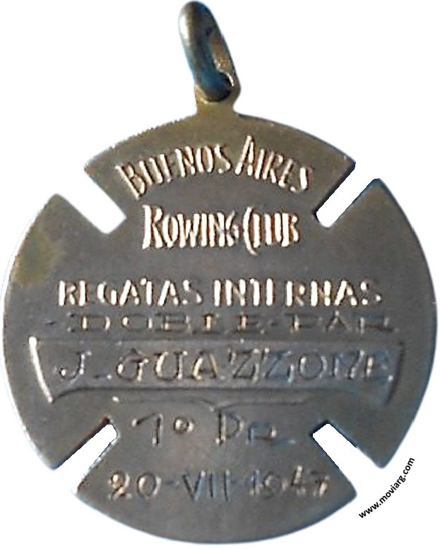 Anverso: Campo: B. A. / R. C. Reverso: BUENOS AIRES / ROWING CLUB / REGATAS INTERNAS / [ DOBLE PAR ] / [ J. GUAZZONE ] / [ 1° PR. ] / [ 20 - VII - 1947 ] Referencia: | |
