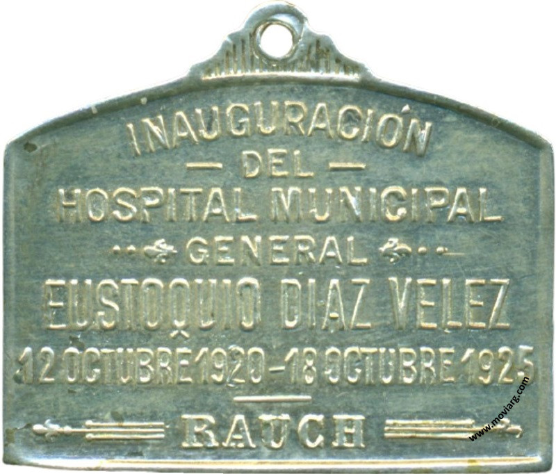 Anverso: Firma: CONSTANTE ROSSI Reverso: INAUGURACIÓN / DEL / HOSPITAL MUNICIPAL / GENERAL / EUSTOQUIO DIAZ VELEZ / 12 OCTUBRE 1920 - 18 OCTUBRE 1925 / RAUCH Referencia: | |