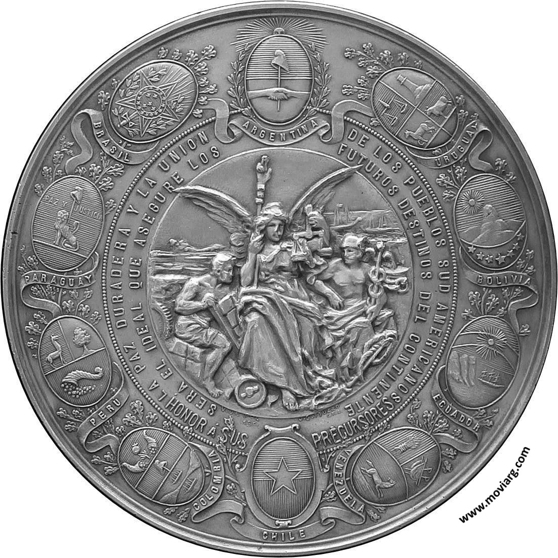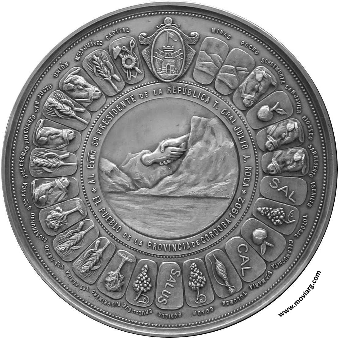 Anverso: AL EXMO. SR. PRESIDENTE DE LA REPÚBLICA T. GRAL. JULIO A. ROCA / EL PUEBLO DE LA PROVINCIA DE CÓRDOBA 1902. Exergo: MINAS / POCHO / SOBREMONTE / SAN JAVIER / RIO SECO / SAN ALBERTO / ISCHILIN / SAL / TOTORAL / CALAMUCHITA / STA. MARIA / CAL / TULUMBA / COLON / PUNILLA / SALUS / CRUZ DEL EJE / RIO PRIMERO / TRO. ARRIBA / TRO. ABAJO / RIO SEGUNDO / GRAL. ROCA / JREZ. CELMAN / RIO CUARTO / SAN JUSTO / UNIÓN / MCOS. JUÁREZ / CAPITAL Reverso: LA PAZ DURADERA Y LA UNION / DE LOS PUEBLOS SUD AMERICANOS / SERÁ EL IDEAL QUE ASEGURE LOS / FUTUROS DESTINOS DEL CONTINENTE / HONOR Á SUS / PRECURSORES. Exergo: ARGENTINA / URUGUAY / BOLIVIA / ECUADOR / VENEZUELA / CHILE / COLOMBIA / PERU / PARAGUAY / PAZ Y JUSTICIA / BRASIL. Firma: V. DE POL / ESC. / J. GOTTUZZO / GRA. Referencia: | |