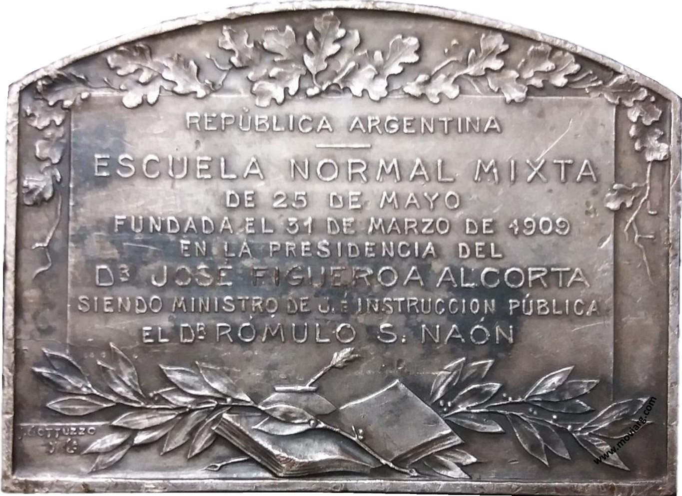 Anverso: Campo: NO HAY REPU / BLICA SIN PUE / BLO EDUCA / DO Reverso: REPÚBLICA ARGENTINA / ESCUELA NORMAL MIXTA / DE 25 DE MAYO / FUNDADA EL 31 DE MARZO DE 1909 / EN LA PRESIDENCIA DEL / DR. JOSÉ FIGUEROA ALCORTA / SIENDO MINISTRO DE J. É INSTRUCCION PÚBLICA / EL DR. RÓMULO S. NAÓN. Firma: J. GOTTUZZO / Y CA. Referencia: | |