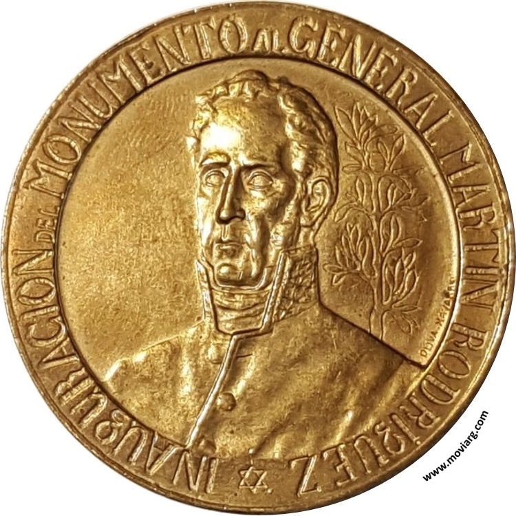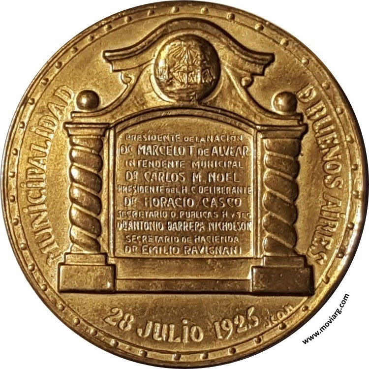 Anverso: INAUGURACION DEL MONUMENTO AL GENERAL MARTIN RODRIGUEZ. Firma: OLIVA NAVARRO Reverso: MUNICIPALIDAD / DE BUENOS AIRES / 28 JULIO 1925. Firma: J.C.O.N. Campo: PRESIDENTE DE LA NACION / DR. MARCELO T. DE ALVEAR / INTENDENTE MUNICIPAL / DR. CARLOS M. NOEL / PRESIDENTE DEL H. C. DELIBERANTE / DR. HORACIO CASCO / SECRETARIO DE O. PUBLICAS H. Y SEG. / DR. ANTONIO BARRERA NICHOLSON / SECRETARIO DE HACIENDA / DR. EMILIO RAVIGNANI Referencia: | |