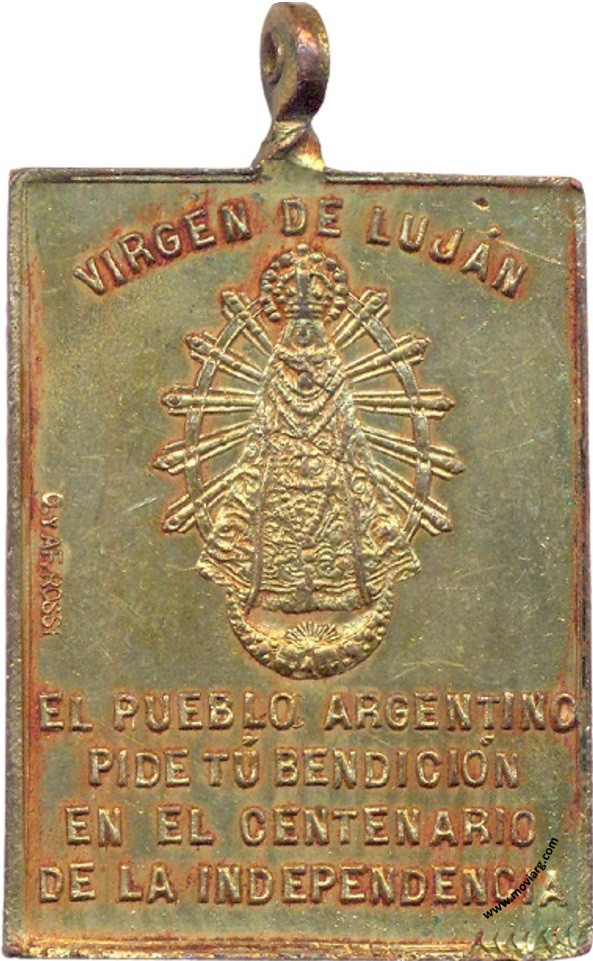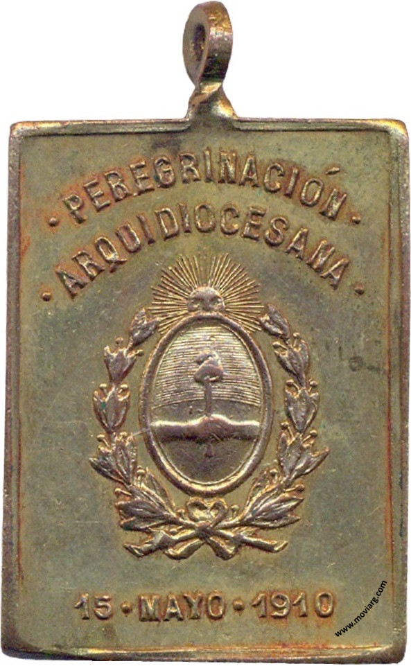 Anverso: PEREGRINACIÓN / ARQUIDIOCESANA / 15 · MAYO · 1910 Reverso: VIRGEN DE LUJÁN / EL PUEBLO ARGENTINO / PIDE TÚ BENDICIÓN / EN EL CENTENARIO / DE LA INDEPENDENCIA. Firma: C. Y AF. ROSSI Referencia: | |