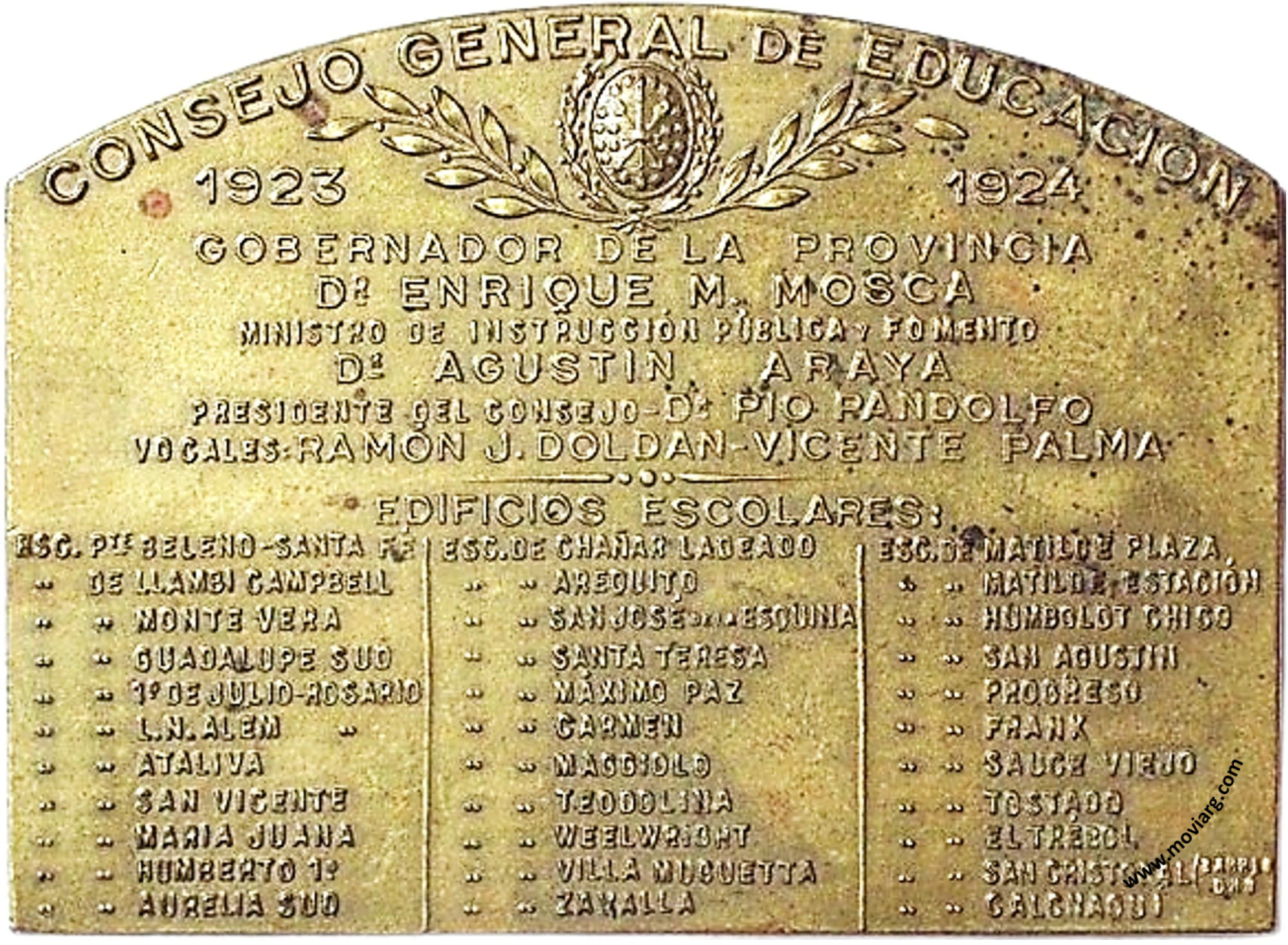Anverso: Campo: NO HAY REPU / BLICA SIN PUE / BLO EDUCA / DO Reverso: CONSEJO GENERAL DE EDUCACION / 1923 / 1924 / GOBERNADOR DE LA PROVINCIA / DR. ENRIQUE M. MOSCA / MINISTRO DE INSTRUCCIÓN PÚBLICA Y FOMENTO / DR. AGUSTIN ARAYA / PRESIDENTE DEL CONSEJO - DR. PIO RANDOLFO / VOCALES RAMÓN J. DOLDAN - VICENTE PALMA / EDIFICIOS ESCOLARES: / ESC. PTE. BELENO - SANTA FÉ / " DE LLAMBI CAMPBELL / " " MONTE VERA / " " GUADALUPE SUO / " " 9° DE JULIO - ROSARIO / " " L. N. ALEM " / " " ATALIVA / " " SAN VICENTE / " " MARIA JUANA / " " HUMBERTO 1° / " " AURELIA SUD / ESC. DE CHAÑAR LADEADO / " " AREQUITO / " " SAN JOSÉ DE LA ESQUINA / " " SANTA TERESA / " " MÁXIMO PAZ / " " CARMEN / " " MAGGIOLO / " " TEODOLINA / " " WEELWRIGHT / " " VILLA MUGUETTA / " " ZAVALLA / ESC. DE MATILDE PLAZA, / " " MATILDE ESTACIÓN / " " HUMBOLT CHICO / " " SAN AGUSTIN / PROGRESO / " " FRANK / " " SAUCE VIEJO / " " TOSTADO / " " EL TRÉBOL / " " SAN CRISTOBAL ( BARRIO (?) / " " CALCHAQUI Referencia: | |