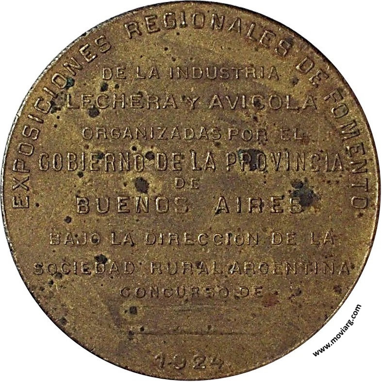 Anverso: Firma: F. COSTA Reverso: EXPOSICIONES REGIONALES DE FOMENTO / DE LA INDUSTRIA / LECHERA Y AVICOLA / ORGANIZADAS POR EL / GOBIERNO DE LA PROVINCIA / DE / BUENOS AIRES / BAJO LA DIRECCION DE LA / SOCIEDAD RURAL ARGENTINA / CONCURSO DE / 1924 Referencia: | |
