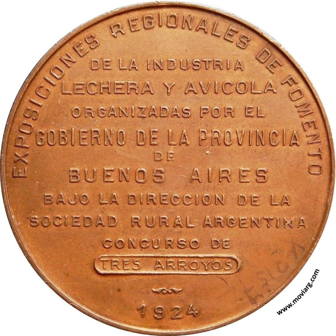 Anverso: Firma: F. COSTA Reverso: EXPOSICIONES REGIONALES DE FOMENTO / DE LA INDUSTRIA / LECHERA Y AVICOLA / ORGANIZADAS POR EL / GOBIERNO DE LA PROVINCIA / DE / BUENOS AIRES / BAJO LA DIRECCION DE LA / SOCIEDAD RURAL ARGENTINA / CONCURSO DE / TRES ARROYOS / 1924 Referencia: | |