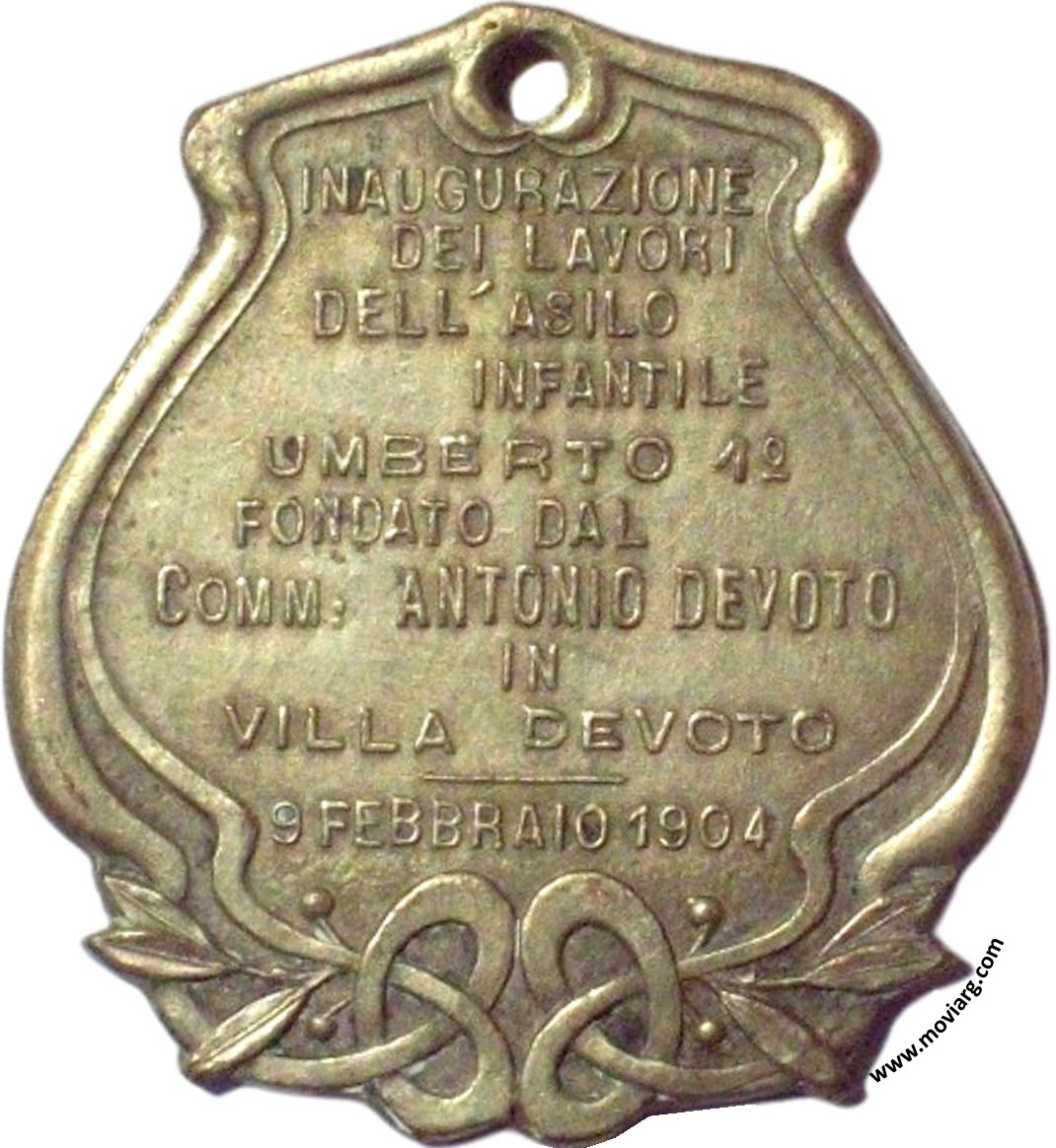 Anverso: Firma: BELLAGAMBA Y ROSSI Reverso: INAUGURAZIONE / DEI LAVORI / DELL' ASILO / INFANTILE / UMBERTO 1° / FONDATO DAL / COMM. ANTONIO DEVOTO / IN / VILLA DEVOTO / 9 FEBBRAIO 1904 Canto: Humberto Burzio: "Buenos Aires en la medalla" 1981 p1017. Referencia: BURZIO-3214 | |