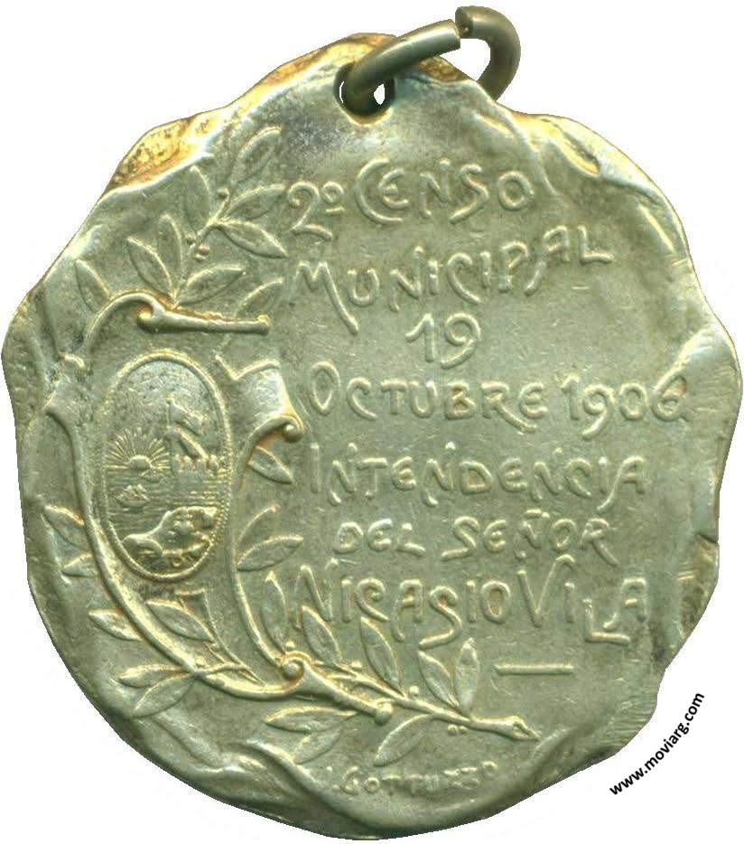 | Año: 1906 Censos Metal: Plateado - Peso: 15.6gr - Módulo: 33mm - Rotación: 12hrs Grabador: Juan Gottuzzo | |