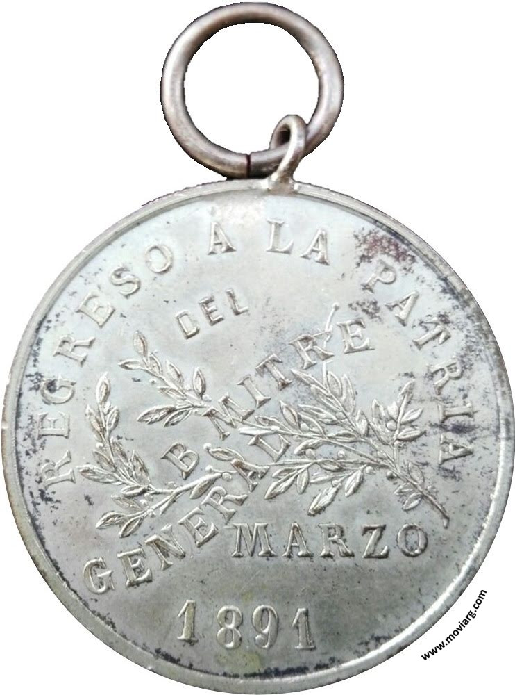 Anverso: Firma: J. DOMINGO Reverso: REGRESO Á LA PATRIA / DEL / GENERAL / B. MITRE / MARZO / 1891 Canto: Humberto Burzio: "Buenos Aires en la medalla" 1981 p33. Referencia: BURZIO-55 | |