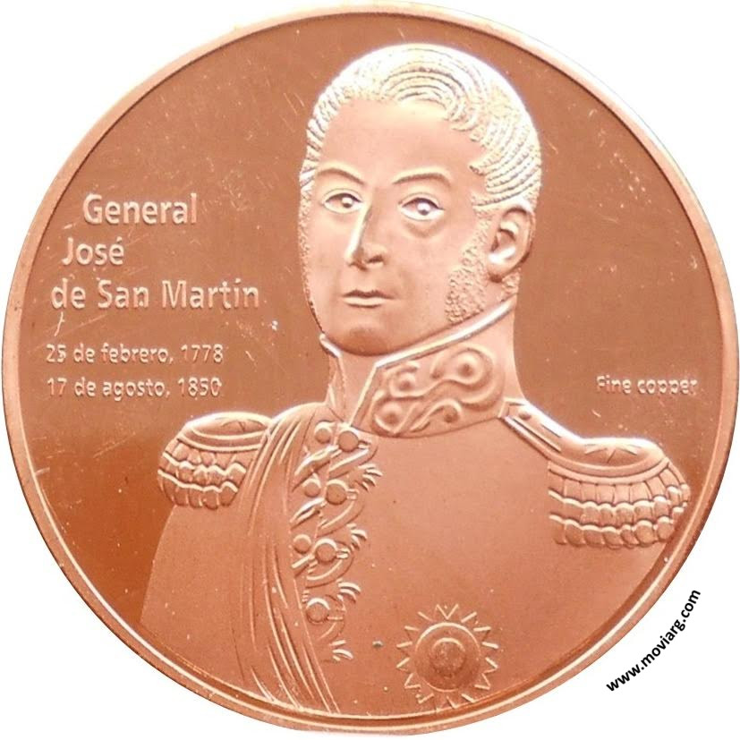 Anverso: GENERAL / JOSÉ / DE SAN MARTIN / 25 DE FEBRERO 1778 / 17 DE AGOSTO 1850. Campo: FINE COPPER Reverso: REPUBLICA ARGENTINA / PERSONAJES DE LA HISTORIA Y LA CULTURA Referencia: | |