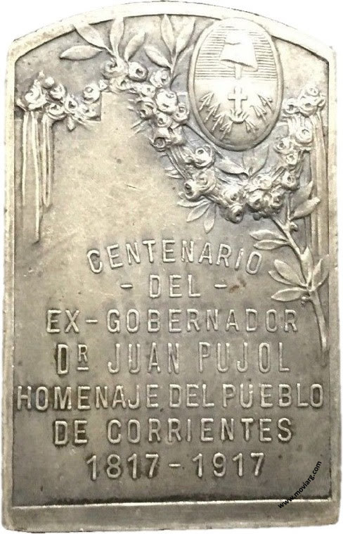 Anverso: Firma: CONSTANTE ROSSI Reverso: CENTENARIO / - DEL - / EX - GOBERNADOR / DR. JUAN PUJOL / HOMENAJE DEL PUEBLO / DE CORRIENTES / 1817 - 1917 Canto: Liso Referencia: | |