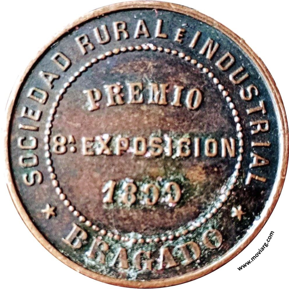 Anverso: CULTIVAR EL SUELO ES SERVIR Á LA PATRIA Reverso: SOCIEDAD RURAL É INDUSTRIAL / PREMIO / 8A. EXPOSICION / 1899 / BRAGADO Referencia: | |