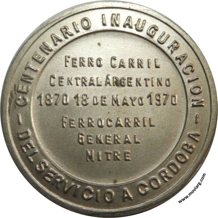 Anverso: CIVILIZACION Y PROGRESO / PARA LA PATRIA. Campo: ALPACA Reverso: CENTENARIO INAUGURACION / DEL SERVICIO A CORDOBA / FERRO CARRIL / CENTRAL ARGENTINO / 1870 18 DE MAYO 1970 / FERROCARRIL / GENERAL / MITRE Referencia: | |