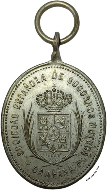 Anverso: SOCIEDAD ESPAÑOLA DE SOCORROS MUTUOS / CAMPANA. Firma: PIEDAD / 734 Reverso: CONMEMORANDO / EL / ANIVERSARIO / DE SU / FUNDACION / AÑO / 1887 Referencia: | |