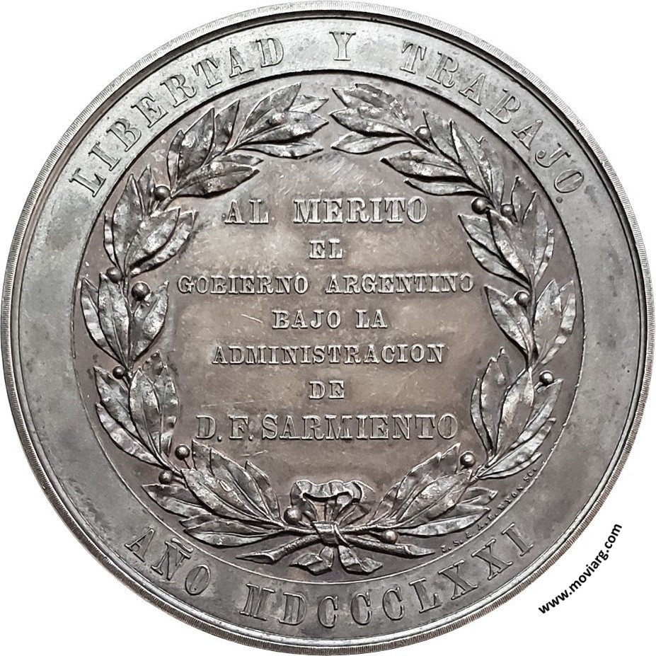 Anverso: REPUBLICA ARGENTINA / EXPOSICION NACIONAL EN CORDOBA. Firma: J.S. & A.B. WYON SC. Reverso: LIBERTAD Y TRABAJO / AÑO MDCCCLXXI / AL MERITO / EL / GOBIERNO ARGENTINO / BAJO LA / ADMINISTRACION / D.F. SARMIENTO. Firma: J.S. & A.B. WYON SC. Canto: Liso Referencia: | |