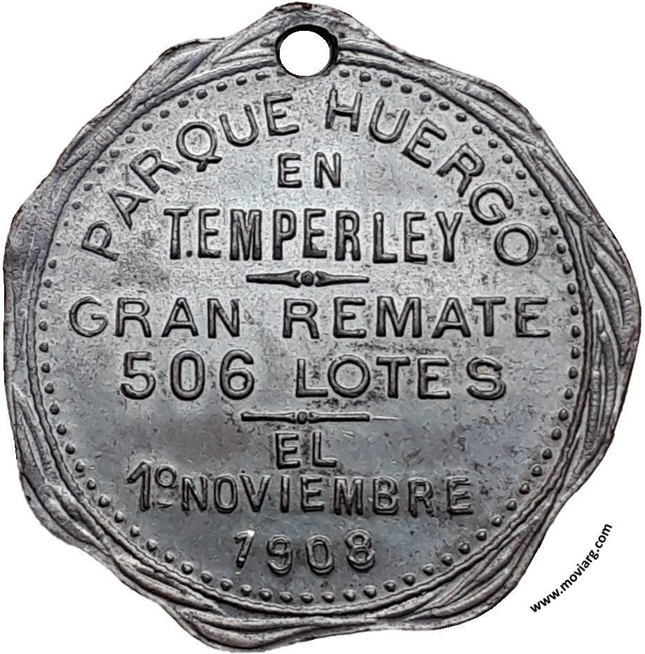 Anverso: PARQUE HUERGO / EN / TEMPERLEY / GRAN REMATE / 506 LOTES / EL / 1° NOVIEMBRE / 1908 Reverso: VALIDA PARA EL TREN / Á LA 1 Y 30 / DE CONSTITUCION / V. S. VINELLI Y HNO. / - 284 - / SAN MARTIN Referencia: | |