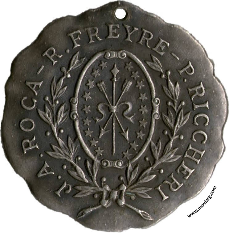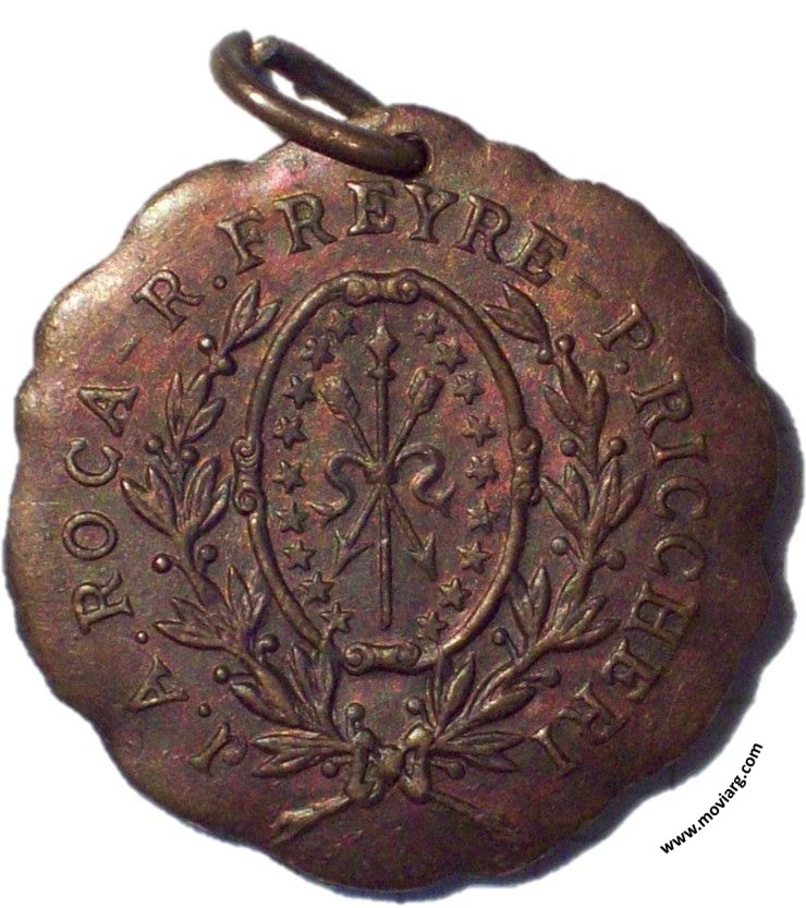 Anverso: J. A. ROCA - R. FREYRE - P. RICCHERI Reverso: PIEDRA FUNDAMENTAL ARSENAL NACIONAL DE GUERRA / CAMPO / GRANADEROS / EN / SAN LORENZO / 3 OCTUBRE / 1904. Firma: M. VANZO Referencia: | |