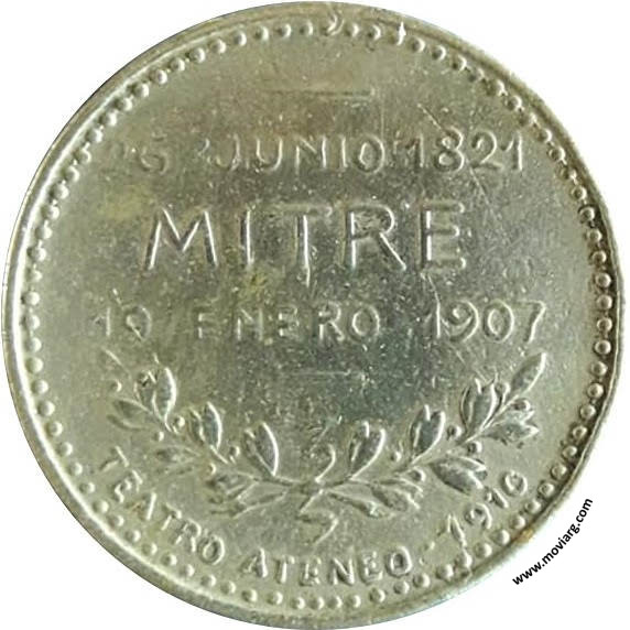 Anverso: Reverso: 26 JUNIO 1821 / MITRE / 19 ENERO 1907 / TEATRO ATENEO · 1910 Referencia: | |