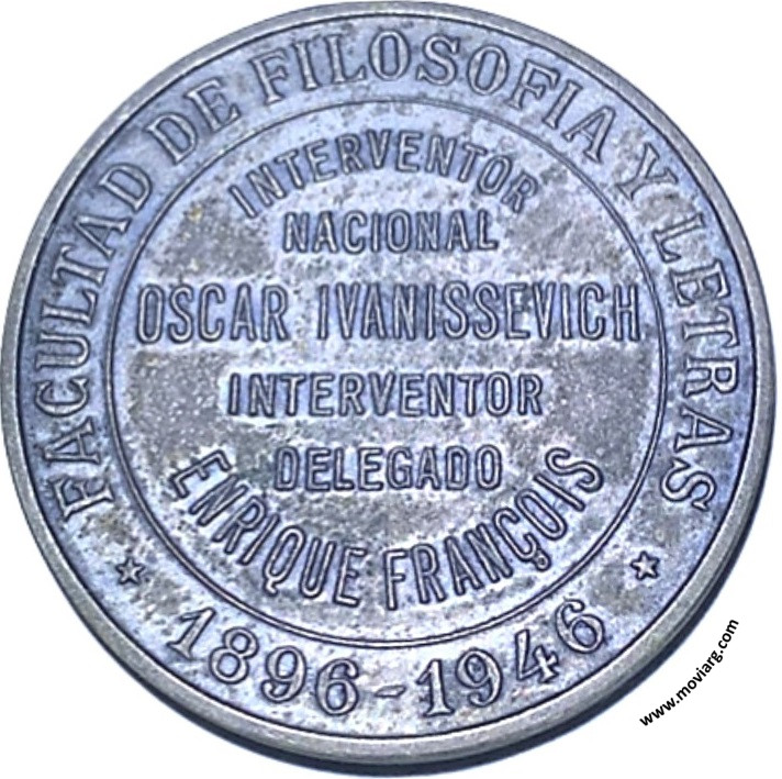 Colección Magnin Anverso: UNIVERSIDAD DE BUENOS AIRES / ARGTNAVIRTVSROBVRJSTVDIM. Firma: E. DE LA CÁRCOVAReverso: FACULTAD DE FILOSOFIA Y LETRAS / INTERVENTOR / NACIONAL / OSCAR IVANISSEVICH / INTERVENTOR / DELEGADO / ENRIQUE FRANÇOIS / 1896 - 1946 Referencia: | |