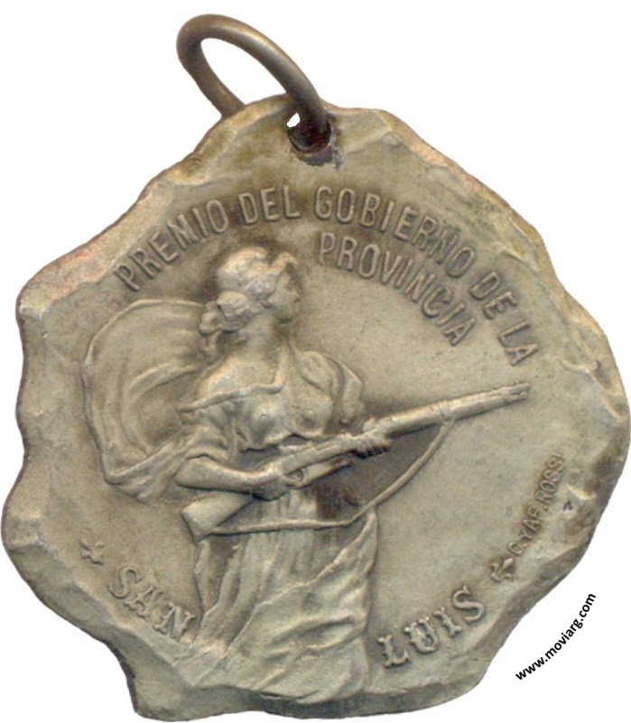 Anverso: PREMIO DEL GOBIERNO DE LA / PROVINCIA / SAN / LUIS. Firma: C. Y AF. ROSSI Reverso: CONCURSO DE TIRO DE LA ACADEMIA MILITAR / 1810 - MAYO - 1910 / 1ER. CENTENARIO Referencia: | |