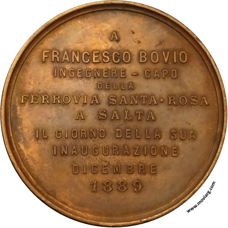 Colección Matías Losinno Anverso: LA SOCIETÁ ITALIANA DI M_ S_ XX SETTEMBRE DI SALTA / DEDICAReverso: A / FRANCESCO BOVIO / INGEGNERE - CAPO / DELLA / FERROVIA SANTA ROSA / A SALTA / IL GIORNO DELLA SUA / INAUGURAZIONE / DICEMBRE / 1889 Referencia: | |