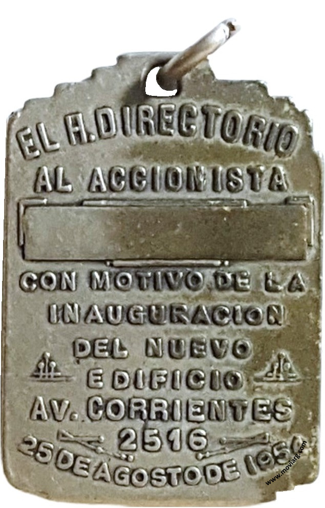 Anverso: BANCO ISRAELITA DEL / RIO DE LA PLATA Reverso: EL H. DIRECTORIO / AL ACCIONISTA / CON MOTIVO DE LA / INAUGURACION / DEL NUEVO / EDIFICIO / AV. CORRIENTES / 2516 / 25 DE AGOSTO DE 1954 Referencia: | |