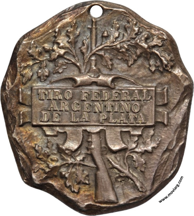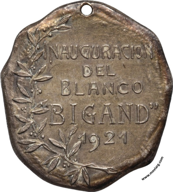 Anverso: TIRO FEDERAL / ARGENTINO / DE LA PLATA Reverso: INAUGURACION / DEL / BLANCO / " BIGAND " / 1921 Canto: Liso. PLATA Referencia: | |