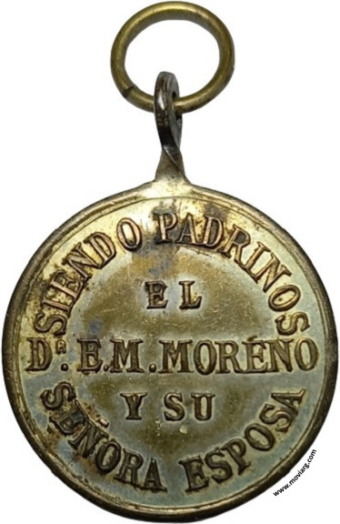 Anverso: BENDICION DE LA IGLESIA DE COLON / 1889 Reverso: SIENDO PADRINOS / EL / DR. E. M. MORENO / Y SU / SEÑORA ESPOSA Referencia: | |