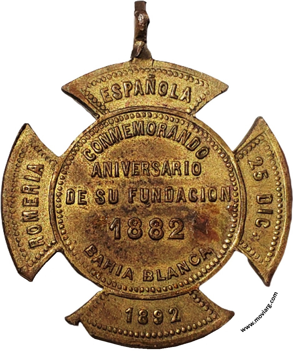Anverso: SOCIEDAD / ESPAÑOLA / SOCORROS / MUTUOS Reverso: ROMERIA / ESPAÑOLA / 25 DIC. / 1892 / CONMEMORANDO / ANIVERSARIO / DE SU FUNDACION / 1882 / BAHIA BLANCA Referencia: | |