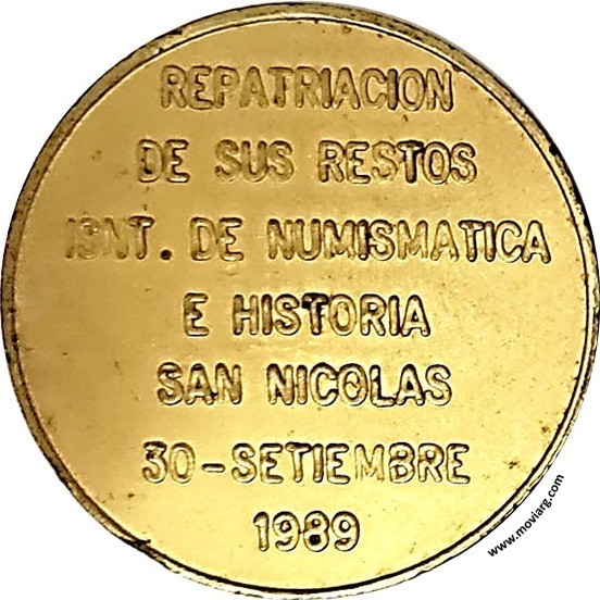 Anverso: JUAN MANUEL DE ROSAS / 1793 - 1877 Reverso: REPATRIACION / DE SUS RESTOS / ISNT. (sic) DE NUMISMATICA / E HISTORIA / SAN NICOLAS / 30 - SETIEMBRE / 1989 Referencia: | |