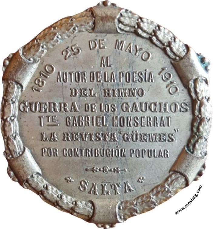 Anverso: Firma: C. Y AF. ROSSI Reverso: 1810 25 DE MAYO 1910 / AL / AUTOR DE LA POESÍA / DEL HIMNO / GUERRA DE LOS GAUCHOS / TTE. GABRIEL MONSERRAT / LA REVISTA " GÜEMES " / POR CONTRIBUCIÓN POPULAR / SALTA Referencia: | |