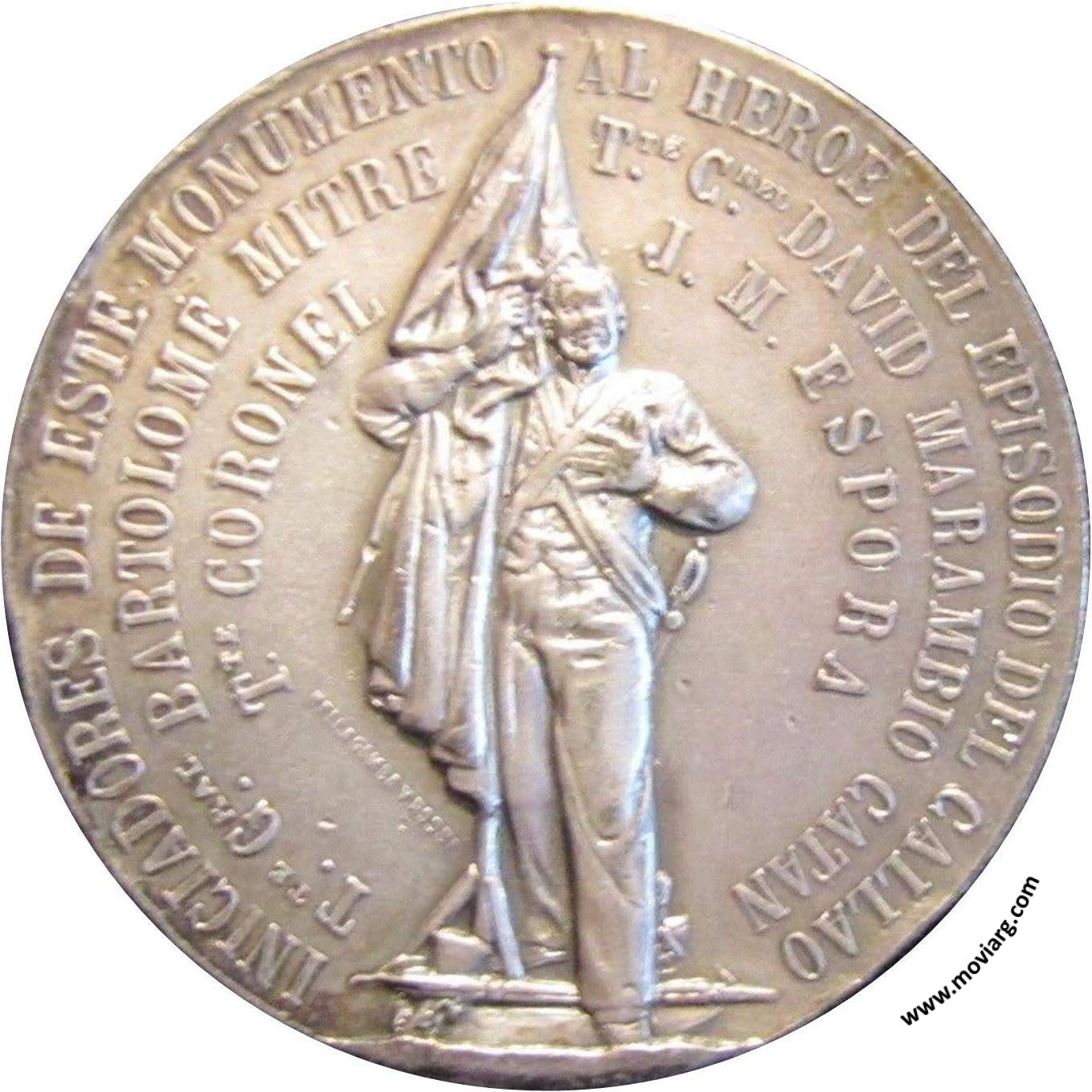 Anverso: INICIADORES DE ESTE MONUMENTO AL HEROE DEL EPISODIO DEL CALLAO / TTE. GRAL. BARTOLOMÉ MITRE / TTE. GRAL. DAVID MARAMBIO CATAN / TTE. CORONEL / J. M. ESPORA. Firma: BELLGAMBA Y ROSSI Reverso: LA ASOCIACION PATRIÓTICA / FALUCHO / EN HONOR AL EXMO. SR. PRESIDENTE / DE LA REPÚBLICA / DE LOS ESTADOS UNIDOS DEL BRASIL / DR. MANUEL FERRAZ DE CAMPOS SALLES / Y SU COMITIVA / CON MOTIVO DE SU VISITA / Á LA / REPÚBLICA ARGENTINA / OCTUBRE 1900 Referencia: BURZIO-1477 | |