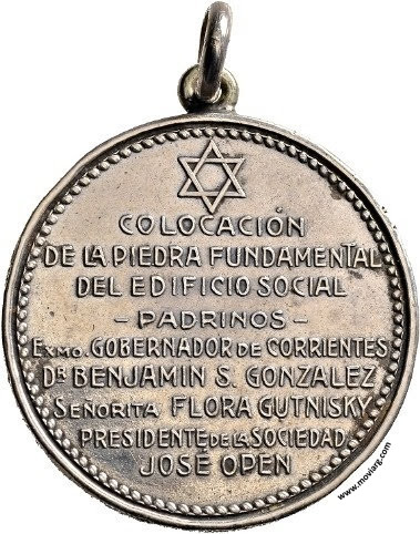 Anverso: SCHOLEM ALEJEM ( SOCIEDAD ISRAELITA ) / CORRIENTES 8 DE JULIO DE 1928 Reverso: COLOCACIÓN / DE LA PIEDRA FUNDAMENTAL / DEL EDIFICIO SOCIAL / - PADRINOS - / EXMO. GOBERNADOR DE CORRIENTES / DR. BENJAMIN S. GONZALEZ / SEÑORITA FLORA GUTNISKY / PRESIDENTE DE LA SOCIEDAD / JOSÉ OPEN Referencia: | |