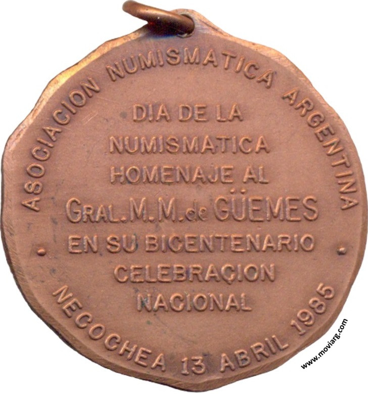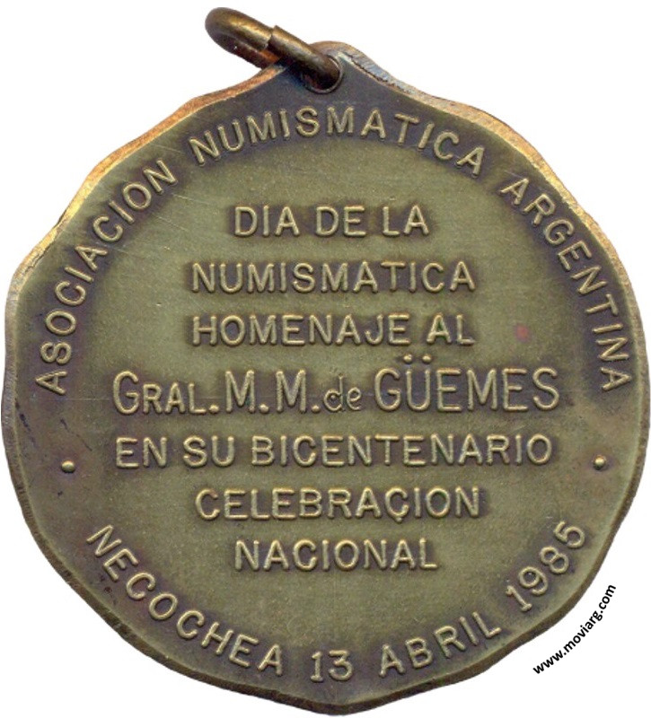Anverso: Reverso: ASOCIACION NUMISMATICA ARGENTINA / DIA DE LA / NUMISMATICA / HOMENAJE AL / GRAL. M. M. DE GÜEMES / EN SU BICENTENARIO / CELEBRACION / NACIONAL / NECOCHEA 13 ABRIL 1985 Referencia: | |