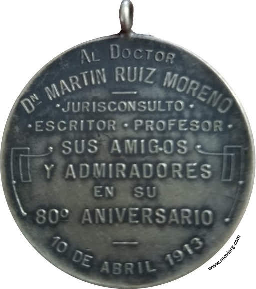 Anverso: Firma: C. Y AF. ROSSI Reverso: AL DOCTOR / DN. MARTIN RUIZ MORENO / JURISCONSULTO / ESCRITOR PROFESOR / SUS AMIGOS / Y ADMIRADORES / EN SU / 80° ANIVERSARIO / 10 DE ABRIL 1913 Referencia: | |